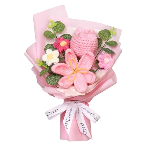 Dremisland virkad blombukett rosa konstgjorda blommor bukett konstgjorda tulpaner blommor tusensköna med vas virkade blommor virkade blommor växter stickad bukett gåva för vänner familj