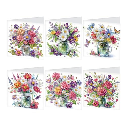 SHEGZHUC Set med 6 diamantmålning, gratulationskort, set blommor, vas, diamantmålning, kort, födelsedagskort, tackkort, välsignelse, kort, semesterkort, broderi, korsstygn diamantmålning, gåva