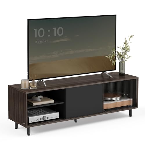 VASAGLE Supersnabb verktygsfri montering, TV-möbel för TV upp till 60 tum, TV-bord vardagsrum, räfflat glas, 140 x 39 x 45 cm, verktygslös teknik, askbrun-ink svart LTV466K02