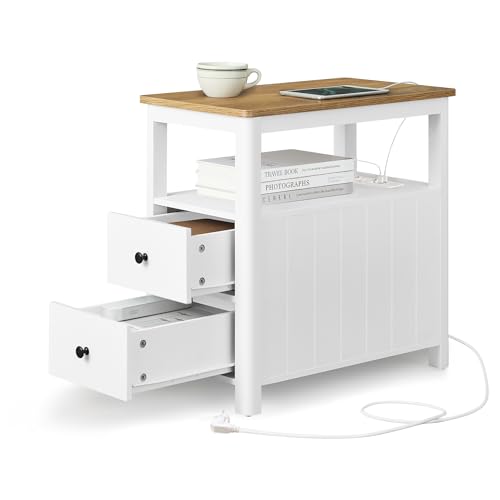 VASAGLE Bord med laddningsstation, smalt nattduksbord med 2 lådor, soffbord med förvaringshylla, för små utrymmen, kuststil, valnötsbrun och vit LET327W14