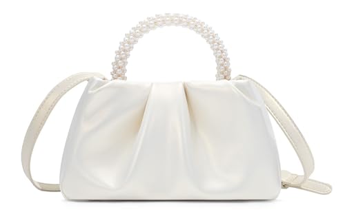 Beatfull Aftonväska för damer, liten handväska med pärlhandtag, mjukt läder, plisserad väska, clutchväska för bröllop, fest, bal, axelremsväska, portmonnä, Vitt, small