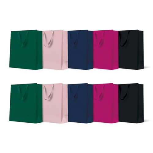 PAW - Presentpåsar 10 x 12 x 6,5 cm - Förpackning med 10 presentpåsar med tyghandtag | 5 enfärgade blandade färger | snygga väskor för födelsedagar, bröllop, babyshower, fester och presenter