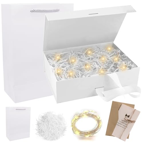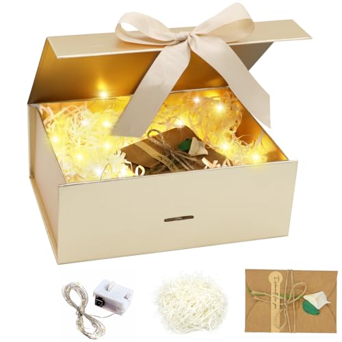 Forhandy Presentask med rosett, presentförpackning med lock L, presentlåda + väska + färgband + ljus, magnetisk presentkartong, presentlåda för bröllop födelsedag (guld)