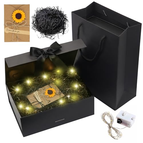 Forhandy Presentask med rosett, presentförpackning med lock L, presentbox + väska + färgband + ljus, magnetisk presentlåda, presentförpackning, för bröllop födelsedag (svart, L)