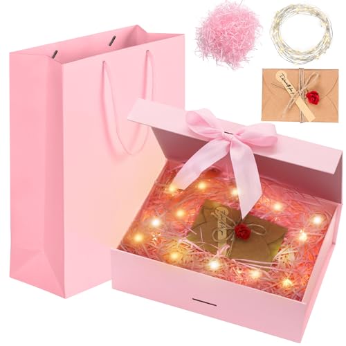 Magnetisk presentförpackning med rosett, 21 x 17 x 7 cm, med lock, väska, färgband, ljus, kuvert – vikbar presentförpackning för bröllop födelsedag