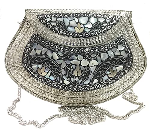 Silver minimalistisk mosaik kuvertväska för henne vintage utsmyckad indisk bohemisk väska - bröllop brud pärlemor handväska