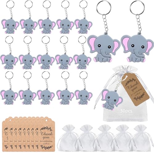 RXKFIGX 30 stycken gästgåvor dop elefant nyckelring + organza-väska + kraftpapper hänge djurhänge tack gåvor för pojke flicka barn födelsedagsfest tillbehör bröllop dop