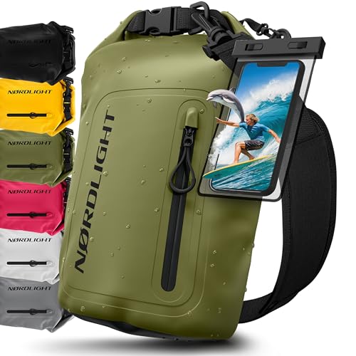 Nordlight Dry Bag och vattentät väska - (2L, Olivgrön) Vattentät packväska med rullstängning och axelrem | Simning, strand, kanotpaddling, stå upp paddling, dykning