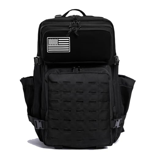 Thuram 50 L taktisk militärryggsäck vattentät hållbar väska för vandring camping fiske gym ryggsäck med flaskhållare, Helt svart, 50 cm (L)