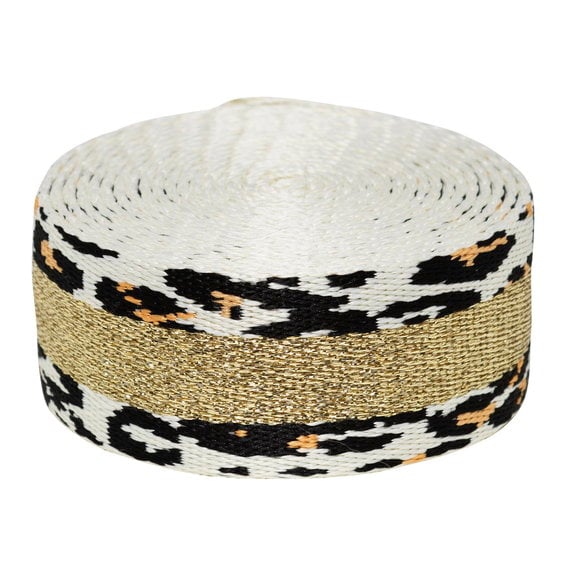 Väskrem, leopardmönster med bred gnistrande guldrand, längd 250 cm, bredd 3,8 cm