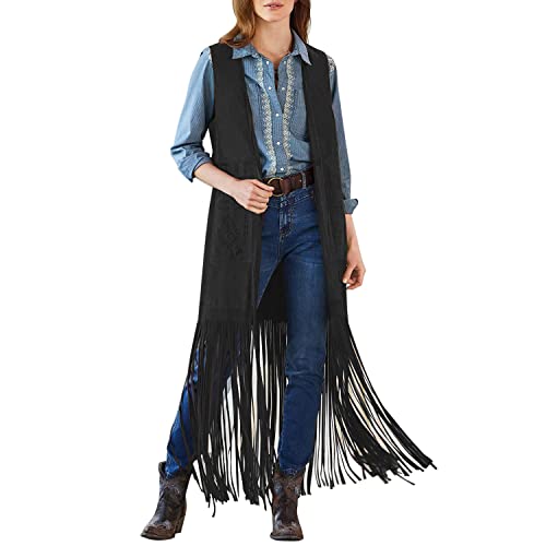 Petalum Dam lång väst med fransar, ärmlös fransväst, kofta, retroväst med fickor, svart, XL