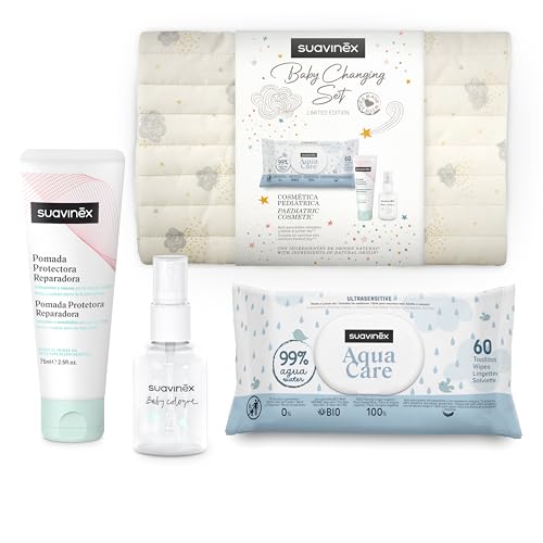 Suavinex, Necessär för bebisar med: reparerande skyddssalva 75 ml Aqua Care våtservetter 60 st baby cologne 50 ml babyhållare och blöjor. Nyfödd present, beige, drömmar