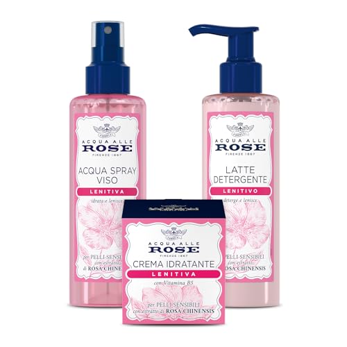 Acqua alle Rose, Lugnande set med Chinensis Roseextrakt, för känslig eller torr hud, innehåller vatten spray 200 ml, fuktgivande kräm 50 ml och rengöringsmjölk 200 ml - Amazon exklusivt
