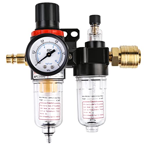 Asfrode Vattenseparator tryckluft 1/4 tum, underhållsenhet tryckreducerare tryckluft regulator kompressor tryckluftsfilter vattenavskiljare tyska snabbkopplingar och manometer (svart)