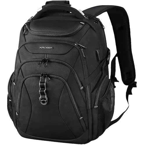 KROSER Ryggsäck för bärbar dator upp till 17,3 tum, XL, TSA datorryggsäck, vattenavvisande, högskola, dagväska, affärsryggsäck, med RFID-fickor och USB-port, för män/kvinnor, svart
