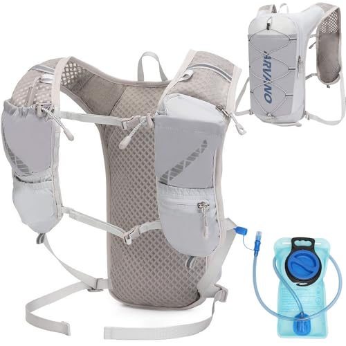 Arvano Löparväst Löparryggsäck med 1,5 liters vattenblåsa, lätt, andningsbar, 5L Hydreringspaket för Trail Löpning Maraton Cykling (Grå, En storlek)