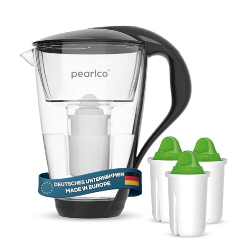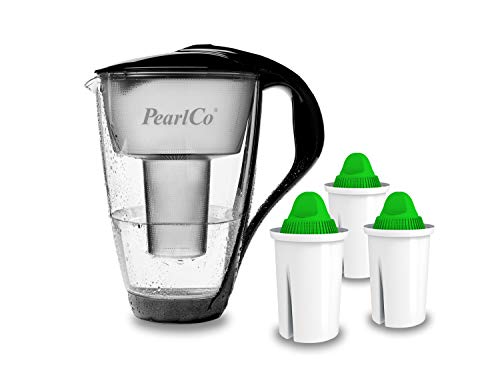 PearlCo 2 l glas-vattenfilterkanna med 3 grundläggande filterpatroner – BPA-fri glaskanna med alkaliskt pH-värde för dricksvatten, 5-stegs filtrering – aktivt kol och jonbytessystem – svart