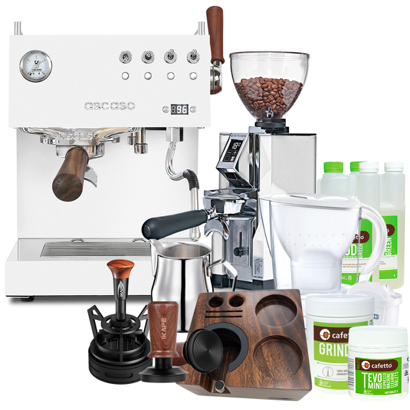 Ascaso Steel Duo Plus White Espressomaskin Inkl. Eureka Mignon Libra 65 Kvarn, Baristautrustning, Vattenfilterkanna & Underhåll