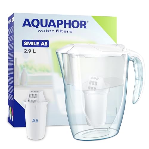 AQUAPHOR Smile Vattenfilterkanna – 2,9 l, passar kylskåpsdörrar, lätta, platsbesparande, inkluderar 1 x A5 350 L filter, minskar kalkavlagring, klor, mikroplast – vit