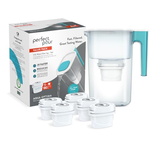 Aqua Optima Oria Vattenfilterkanna & 6 x 30 Day Evolve+ filterpatron, 2,8 liters kapacitet, för reducering av mikroplast, klor, kalkavlagringar och föroreningar, vit (förpackningen kan variera)