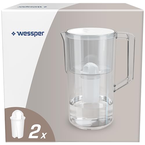 Wessper Aqua Classic Basic vattenfilterkanna 2,5 l, kompatibel med Brita Classic filterpatroner, vatten, filtersystem för att minska kalk, klor, inklusive 2 x vattenfilterpatroner, vit