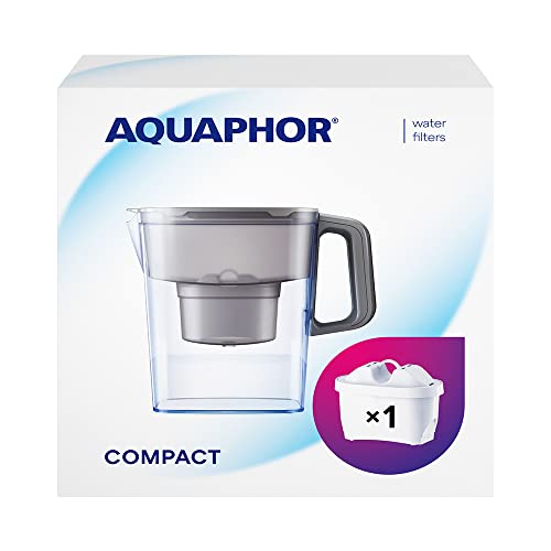 AQUAPHOR Vattenfilterkanna Compact grå inklusive 1 Maxfor+ filter I Plastkaraff 2,4 liter I Minskar kalk, klor & tungmetaller I Kompakt & lätt vattenfilter I Passar i kylskåpsdörren