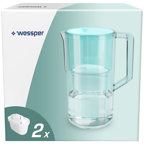 Wessper Aqua Classic Basic vattenfilterkanna 2,5 l, kompatibel med Brita Classic filterpatroner, vattenfiltersystem för att minska kalk, klor, inklusive 2 x vattenfilterpatroner mynta