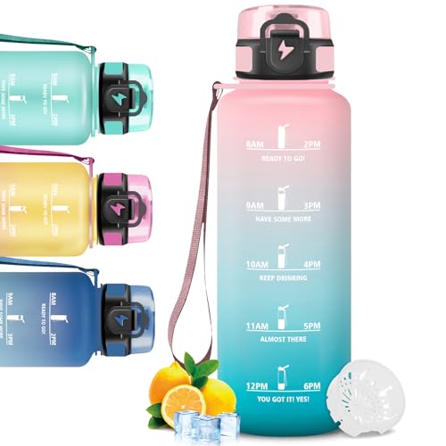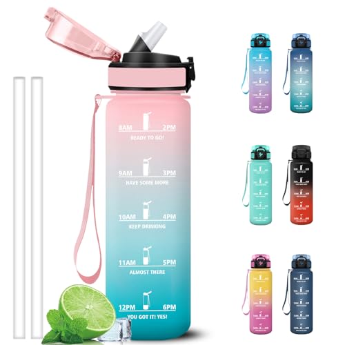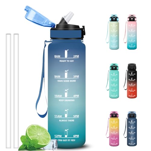HoneyHolly Vattenflaska 1 liter, BPA-fri och läckagesäker, med sugrör, gymvattenflaska, med tidsmarkör, flaska för sport, cykel, gym, skola
