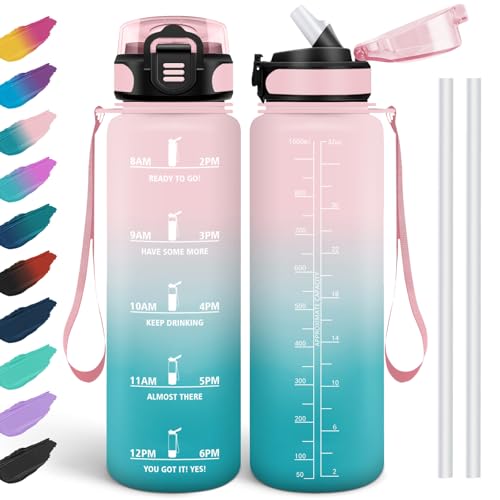 Grsta 1 liters vattenflaska, vattenflaska med tidsmarkör, lätt att rengöra, läcker inte gymflaska med sugrör, motiverande flaska för camping, cykel, vandring