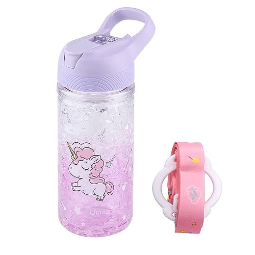 Enhörning vattenflaskor för flickor, kopp med sugrör och säkerhetslås, rosa utomhus inomhus vattenflaska, 400 ml/13,5 oz för skolbarn flicka enhörningsälskare (lila)