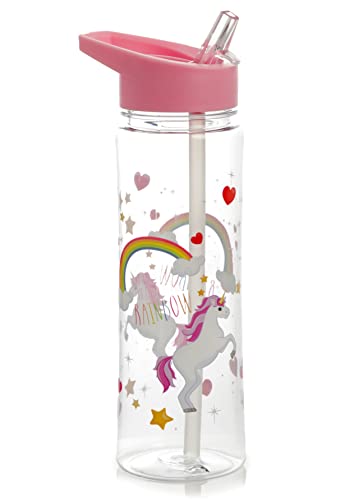 Puckator förtrollade regnbågar enhörning – dryckesflaska för barn med sugrör – återanvändbar vattenflaska för flickor och pojkar med en bifogad lång rem – BPA-fri – för skola barnkammare – söt design