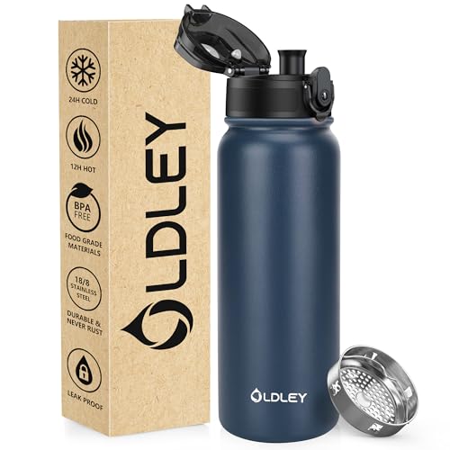 OLDLEY 600 ml/20 oz rostfritt stål vattenflaska dubbelvägg vakuumflaska håller drycken varm och kall läckagesäker BPA-fri 600 ml metallisolerad vattenflaska för sportskola utomhus vandring (marinblå)