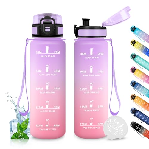 Flaska, 1 liter vattenflaska med filter, läckagefri vandringsflaska, gymflaska, lätt att rengöra, flaska med tider för att dricka, flaska för sport, cykling, vandring, utomhus, lila