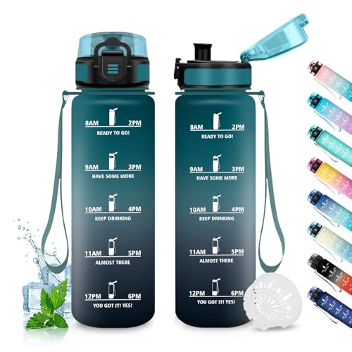 Grsta 1 liter vattenflaska, läckagefri, motiverande vattenflaska med filter, vandringsflaska med motiverande slogan, vattenflaska för sport, vandring, cykling, blågrön
