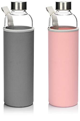 COM-FOUR® 2x vattenflaska av borosilikatglas - dricksflaska i glas för sport med skruvlock i rostfritt stål och termohylsa av neopren i grått och rosa - 1000 ml