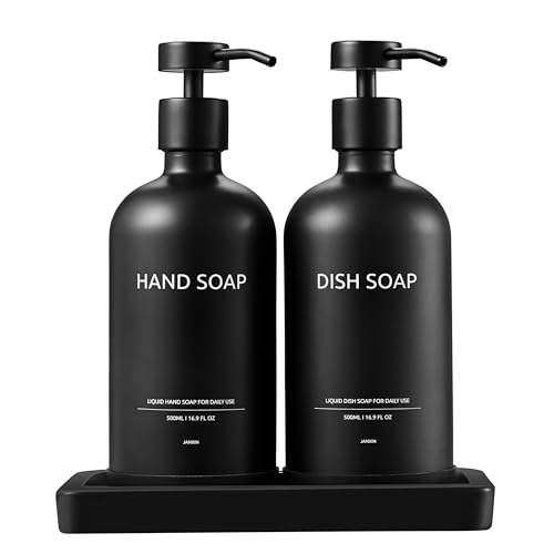 Janxin Tvåldispenser i glas, 500 ml tvåldispenser svart, 500 ml tvåldispenser svart, med keramisk bricka, påfyllningsbar dispenser för handtvål och diskmedel (svart flaska + svart huvud)