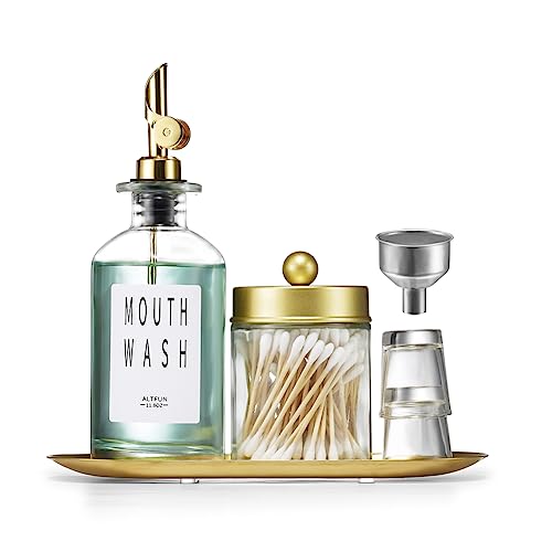 Munvattendispenser i glas för badrum med koppar, stil munskölj behållare flaska med qtip hållare, glasflaska 335 ml påfyllningsbar munskölj dispenser med bricktratt, gyllene