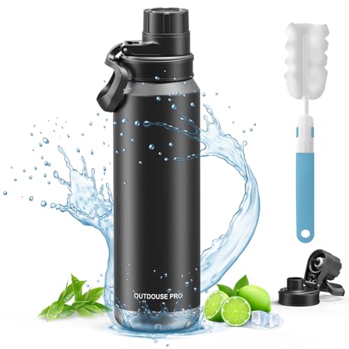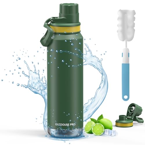 OLDLEY Vattenflaska i rostfritt stål med sugrör 1 l, isolerad flaska med 3 lock, stor termosflaska 1 liter läckagesäker håller dig varm kall för sport gym camping cykel (olivgrön, 3 lock)