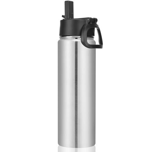 Volhoply 660ml isolerade vattenflaskor med halmlock, sportflaska i rostfritt stål med handtag, dubbelväggig metall resevattentermos med bred mynning,återanvändbar vattenflaska för skolan (silver,1set)
