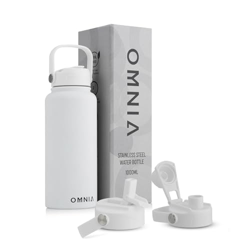 OMNIA vakuumisolerad vattenflaska i rostfritt stål, 2 lock (sugrör och pip) läckagesäker, BPA-fri, återanvändbar plunta, varm och kall termos för sport, gym, resor, utomhus (vit, 1 000 ml)
