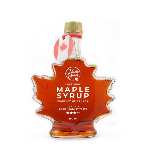 MapleFarm - Ren kanadensisk lönnsirap Grad A - MÖRK – Robust smak – Lövformad flaska – 330g (250ml)