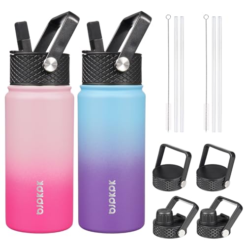 BJPKPK 2-pack isolerade vattenflaskor med sugrörslock, 9,5 dl rostfritt stål metall vattenflaska med 6 lock, läckagesäker BPA-fri termos, koppar, flaskor för resor, sport (körsbär + havsdröm)