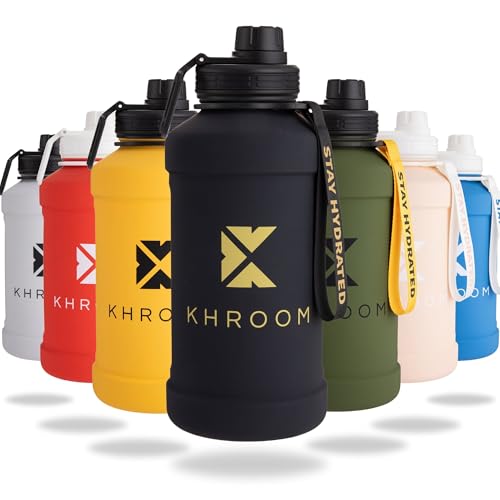 Khroom rostfritt stål vattenflaska 1,3L & 2,2L – lämplig för kolsyrat vatten, läckagesäker, enkelväggig, BPA-fri | metall vattenflaska | 1 Liter gym, fitness och sportflaska svart