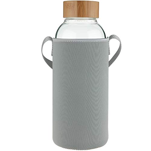 Ferexer 1,5 liter stor vattenflaska i borosilikatglas med bambulock med neoprenhylsa 1 500 ml/1,5 l grå