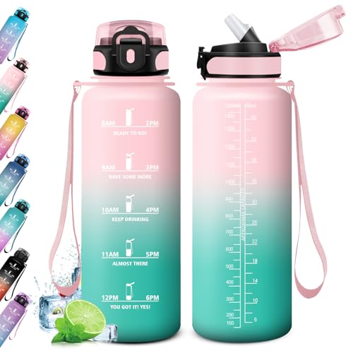 Seekua 1l sportflaska glas med sugrör och motiverande tid 1 liter stor vattenflaska, återanvändbar BPA-fri glas med tidsmarkör