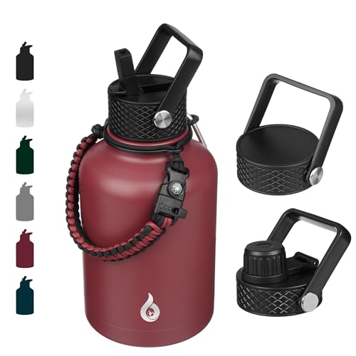 BJPKPK Halv gallon isolerade vattenflaskor med sugrörslock, 2 dl stor vattenflaska, rostfritt stål vattenflaskor med 3 lock och paracordhandtag, vattenflaska för varm och kall vätska, armégrön