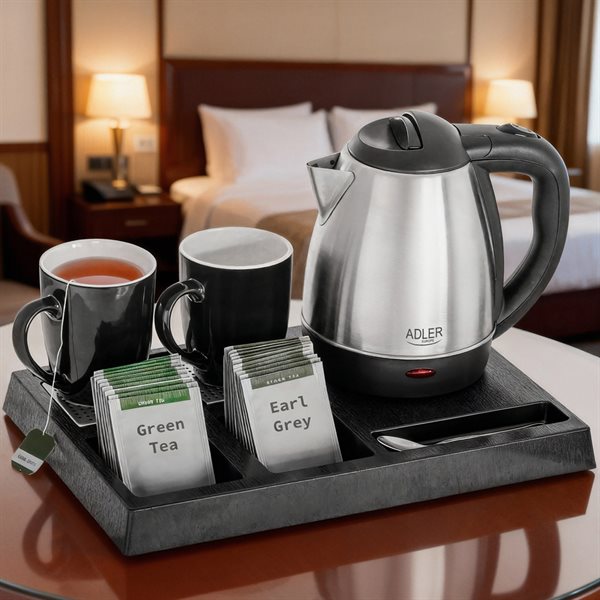 Vattenkokare 1,2 l med välkomstbricka, keramikkoppar och förvaringsfack