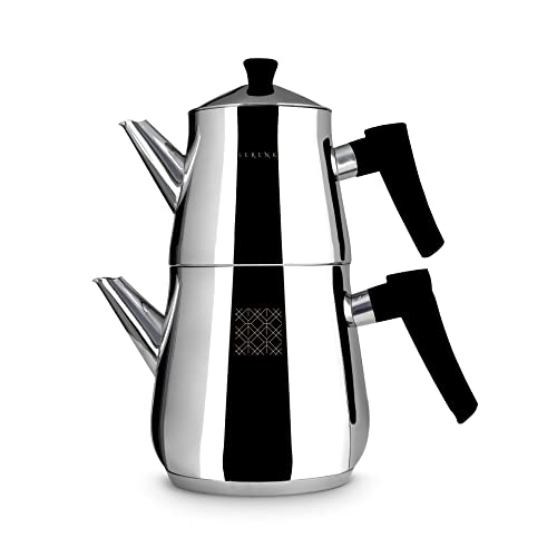 Serenk Rostfritt Stål Turkisk Tekanna Set - Dubbel Vattenkokare Med Kapselbas Och Halkfria Bakelithandtag - För Spishäll Och Induktion - 2995 ml Svart