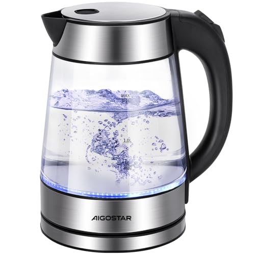 Aigostar Chubby - Elektriskt vattenkokare av borosilikatglas, Vattenkokare av glas och rostfritt stål med LED-belysning, 1,7 liter, 2200 W, Automatisk avstängning, Avtagbart filter, Fri från BPA