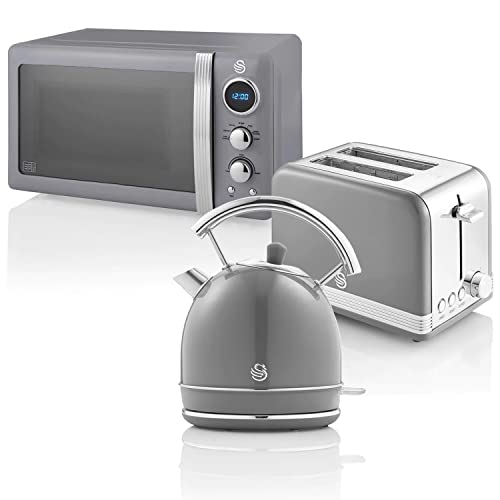 Swan Retro frukostset 1,8 l vattenkokare, 2 skivor bredspår brödrostbrödrost, 20 l digital mikrovågsugn, 6 effektnivåer, timer, spegeldörr, vintage design, grå